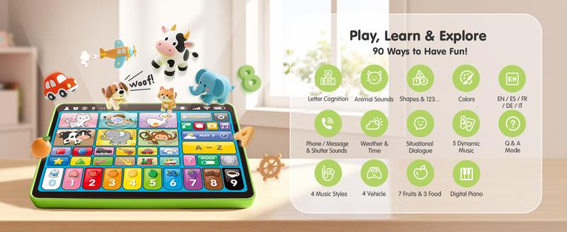 A trilingual interactive learning tablet that teaches language, sounds, and music through fun play.